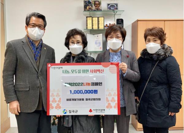 바르게살기운동 칠곡군협의회는 지난 3일 희망2022나눔캠페인이 이웃돕기 성금 100만원을 칠곡군에 기탁했다.