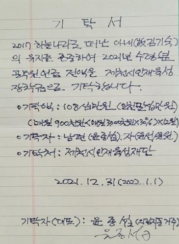 윤 원장은 “아내는 살아생전 40여년 공직생활을 통해 제천시 인재육성 장학기금 100억원 조성을 담당하는 등 해당 분야에 헌신하였다” 고 추억하며, “가족 곁을 떠난 지 어느덧 4주기가 흘렀지만, 올해에도 변함없이 인재육성을 위한 고인의 유지를 받들고자 자녀들과 논의해 유족연금 1년분을 전액 기탁하기로 결정했다” 고 밝혔다.
