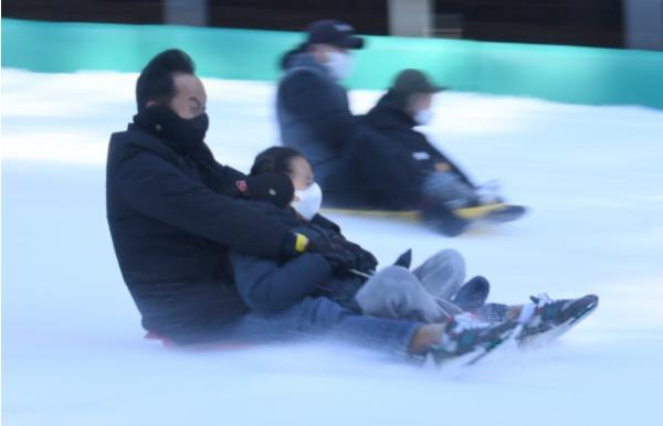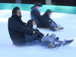 절기상 1년 중 가장 추운 소한을 하루 앞둔 4일 경남 거창군 위천면 수승대 눈썰매장에서 어린이들이 엄마 아빠와 함께 신나게 눈썰매를 타고 있다