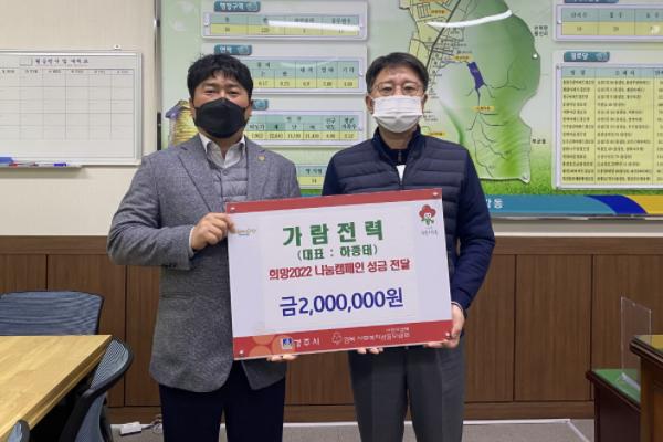 가람전력에서 지난달 31일 용강동 행정복지센터(동장 박효철)를 방문해, 이웃돕기 성금 200만원을 기탁하며 희망2022 나눔 캠페인에 동참했다.