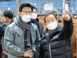 김정섭 공주시장이 5일 아침 임인년 새해 첫 한우 경매가 열린 공주 가축시장을 방문해 축산인들을 격려했다.