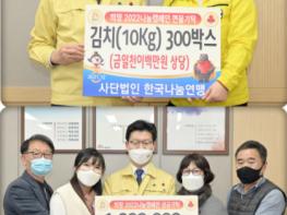 이어 사단법인 한국나눔연맹은 어려운 이웃을 위해 써달라며 김치 300박스(1200만원 상당)를 전달했다.