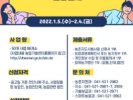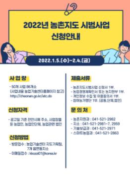 천안시농업기술센터는 1월 5일부터 2월 4일까지 31일간 지역농업경쟁력 강화 및 현장 중심 농업신기술 보급을 위한 2022년 농촌지도 시범사업을 신청받는다고 밝혔다.