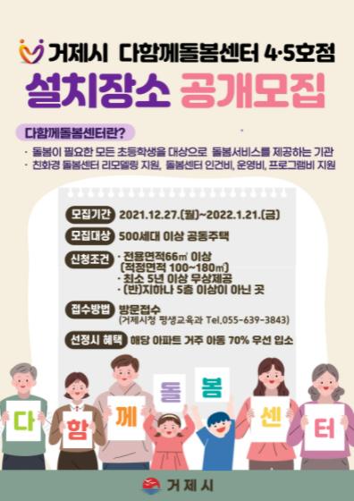 '아이키우기 좋은 도시 조성'에 힘쓰고 있는 거제시가 2022년도 다함께돌봄센터 설치 장소 2개소를 공개 모집한다.