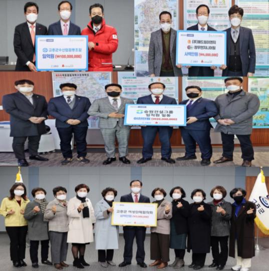또한, 12월 31일에는 고흥군 관내 3개 단지에서 아파트 건설에 참여하고 있는 승원종합건설에서 회사법인과 임직원이 모은 성금 2천만원을 기탁했다.