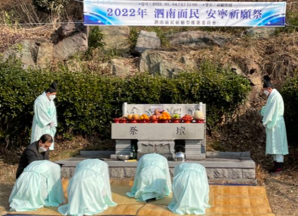 사천시 사남면행정복지센터와 이장협의회가 4일 이구산 아래 구룡저수지 제방 옆에 마련된 기원제단에서 ‘사남면민 안녕 기원제’를 봉행했다.