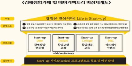 올해부터 김해창업카페와 메이커팩토리는 창업은 일상이다!(Life Is Start-Up!)라는 비전 아래 ① 종합 창업 상담 ② 창업 교양 교육 ③ 창업 전문 교육 ④ 창업자간 네트워킹 프로그램을 요일별로 운영할 예정이다. 특히 메이커팩토리에서는 전문 자격증반을 집중 운영하여 창업과 직접적으로 관련 있는 프로그램을 기획하여 운영할 예정이다.