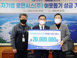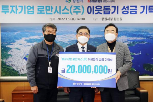 창원시는 5일 오후 2시 접견실에서 지난해 대규모 투자협약기업인 로만시스가 어려운 이웃돕기 성금 2천만원을 기탁했다고 밝혔다.