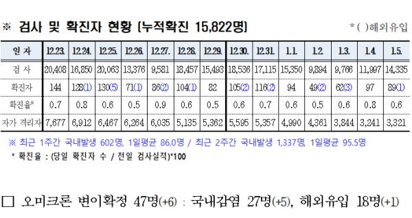 경상북도에서는 1월 5일 15개 시·군(시 9, 군 6)에서 코로나19 확진자 국내감염 88명, 해외감염 1명이 신규 발생했다.