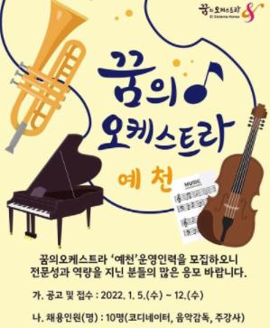 (재)예천문화관광재단은 이달 12일까지 ‘꿈의 오케스트라, 예천’ 운영 인력 10명을 모집한다.