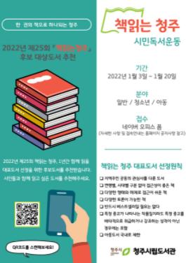 청주시립도서관이 책을 통해 시민과 소통하고 공감하기 위한 2022년 책읽는청주 시민독서운동 후보도서를 오는 1월 20일까지 추천받는다.