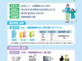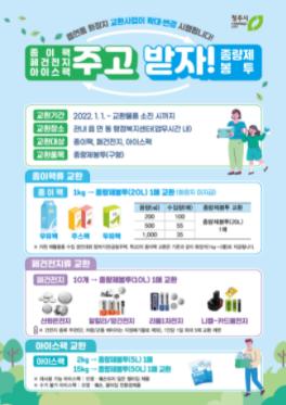 청주시는 2022년부터 읍면동 행정복지센터에서 시민을 대상으로 재활용자원(종이팩, 폐전건지, 아이스팩)을 구형 종량제봉투로 바꿔주는 교환사업을 확대(변경) 시행한다.