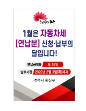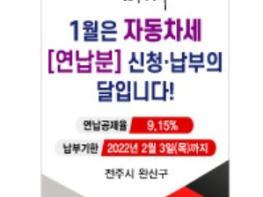 강재원 전주시 세정과장은 “코로나19 장기화로 어려운 시기에 자동차세 연납이 가계 살림에 조금이나마 보탬이 될 것”이라며 “연납 제도를 몰라서 신청하지 못하는 시민이 없도록 홍보에도 힘쓸 것”이라고 말했다.