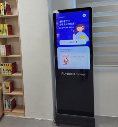 플라이북 스크린은 빅데이터 기반의 이용자 맞춤형 도서 키오스크로, 터치 스크린을 통해 나이, 성별, 관심분야, 기분상태 등의 정보를 입력하면 취향에 맞는 도서를 실시간으로 추천 받을 수 있다.