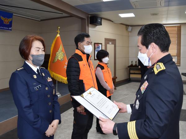 22년 1월 1일 자로 임기가 시작되는 신임 의용소방대장(부대장) 4명에게 임명장 전수, 21년 12월 31일 자로 퇴임한 의용소방대장 2명에게는 감사패 및 정년퇴직 의용소방대원 2명에게는 감사장을 수여했다.