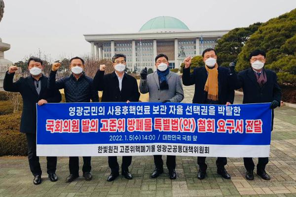 ‘한빛원전 고준위핵폐기물 영광군공동대책위원회’는 지난 5일 국회를 방문하여 김성환 국회의원을 면담하고 대표 발의한'고준위 방사성폐기물 관리에 관한 특별법'입법안에 대한 철회 성명서 및 지역 의견을 전달했다.