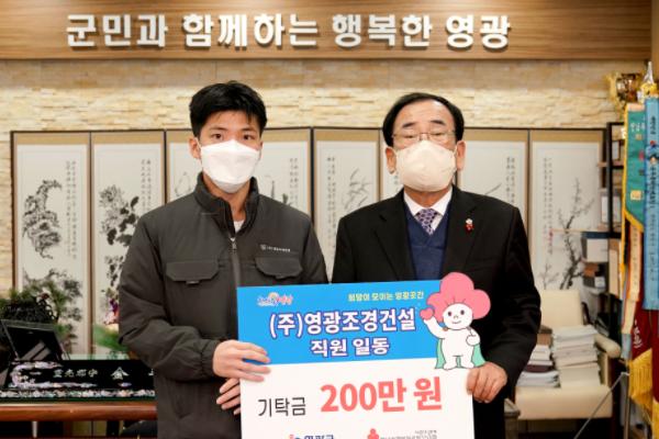 영광군은 지난 5일 (주)영광조경건설 직원일동이 우리군 위기가정과 지역경제 활성화에 사용해 달라며 영광곳간에 기탁금 200만 원을 전달하였다고 밝혔다.
