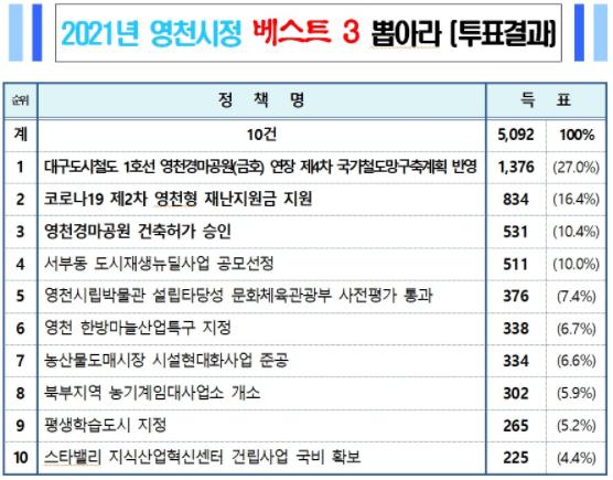 투표 결과 1위는 ‘대구도시철도 1호선 영천경마공원 연장 제4차 국가철도망구축계획 반영’, 2위 ‘코로나19 제2차 영천형 재난지원금 지원’, 3위 ‘영천경마공원 건축허가 승인’이 선정됐다.