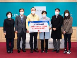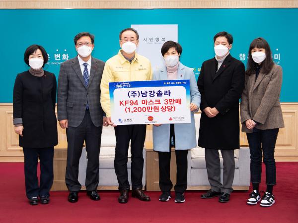 구미시는 1. 6 ㈜남강솔라가 코로나19 극복을 위한 1,200만원 상당의 KF94 마스크 3만매를 기탁하였다고 밝혔다.