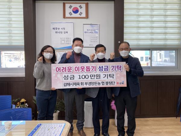 김해시체육회 부경양돈농협 볼링단에서 6일 부원동행정복지센터를 방문하여 감독 및 선수들이 십시일반 모은 성금 100만원을 기탁하였다.