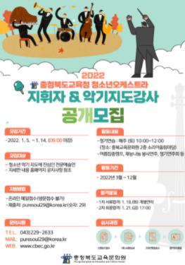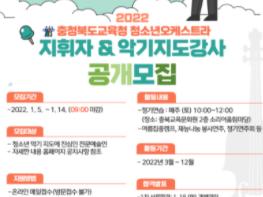 충청북도교육문화원에서는 2022년도 충청북도교육청 청소년오케스트라 지휘자와 지도강사를 모집한다.