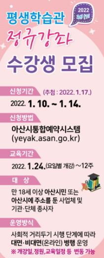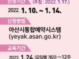 아산시가 오는 10일부터 14일까지 5일간 2022년도 제1기 평생학습관 정규강좌 수강생을 모집한다.