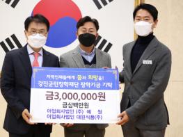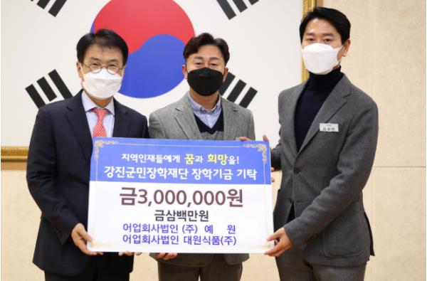 강진군민장학재단은 지난달 31일 어업회사법인 ㈜예원과 대원식품㈜에서 각 200만 원, 100만 원 총 300만 원의 장학금을 기탁했다고 밝혔다.