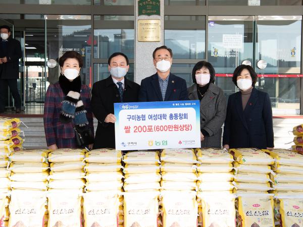 구미농협 여성대학 수료생들로 조직된 봉사단체인 구미농협 여성대학 총동창회에서 기탁한 600만원 상당의 쌀(10kg) 200포는 관내 장애인주간보호시설 7개소 입소자들의 따뜻한 겨울나기에 사용될 예정이다.