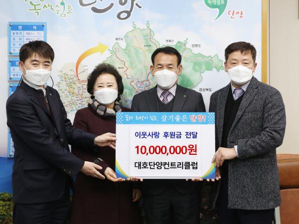 충북 단양군은 대호단양컨트리클럽에서 이웃사랑 후원금으로 1000만원을 기탁했다고 지난 8일 밝혔다.