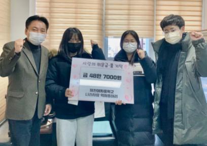 제천여자중학교 나라사랑 동아리(회장 이희원)학생들은 지난 6일, 교동행정복지센터(동장 강충원)를 방문해 48만 7천원을 기부했다.