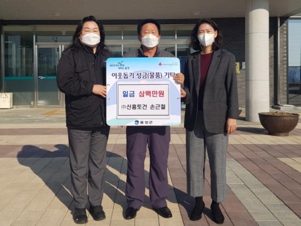 ㈜신흥토건 손근철 대표는 7일 음성읍행정복지센터를 방문하여 불우이웃돕기 성금 300만원을 전달했다. 이 성금은 음성읍지역사회보장협의체 복지사업을 통해 관내 저소득 가구에 사용될 예정이다.