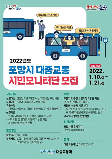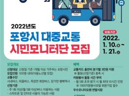 포항시는 시민들의 대중교통 이용만족도와 서비스를 향상하기 위해서 1월 10일부터 21일까지 ‘대중교통 시민 모니터단’을 모집한다.