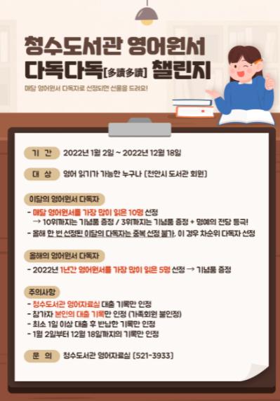 천안시 청수도서관이 1월부터 12월까지 올해 1년간 영어원서 ‘다독다독(多讀多讀) 챌린지’를 운영한다.