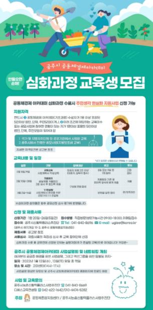 공주시는 농촌 신활력플러스사업 추진 주체가 될 주민조직 발굴을 위한 ‘공동체경제 아카데미’ 심화 과정을 운영한다.