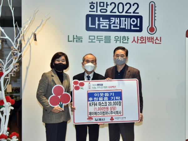 1월 7일 제이에스더컴퍼니주식회사에서 관내 저소득 가정 및 사회복지 시설에 지원하기 위해 KF94마스크 20,000장을 기부함으로써 나눔을 통해 사랑의 온도를 올리는'희망2022 나눔캠페인'에 동참하였다.