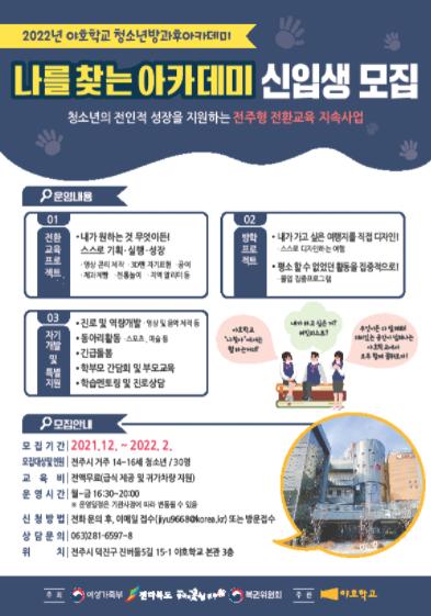 전주시 야호학교는 오는 2월 28일까지 전주지역에 거주하는 14~16세 청소년을 대상으로 2022년 야호학교 청소년방과후아카데미 ‘나를 찾는 아카데미’ 신입생 30명을 모집한다.