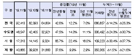 2019년 11월 수도권 거래량은 전년동월 대비 47.5% 증가, 지방은 37.6% 증가했으며 2019.11월 누계 기준, 수도권 거래량은 전년동기 대비 24.3% 감소, 지방은 1.5% 감소했다.