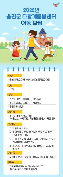 울진군은 오는 21일까지 2022년 다함께돌봄센터 이용아동을 모집한다.