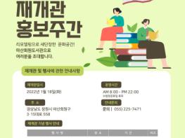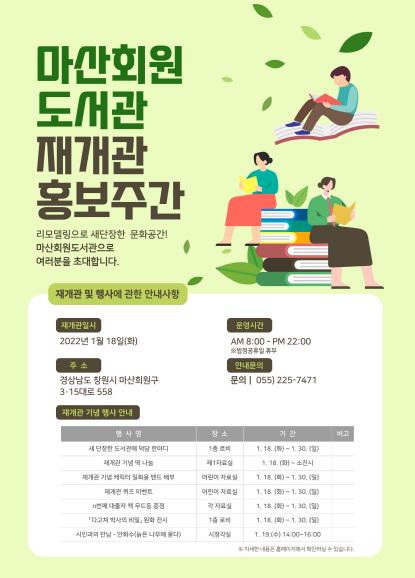 마산회원도서관은 18일부터 30일까지 리모델링 재단장을 기념해 재개관 홍보주간을 운영한다.