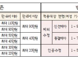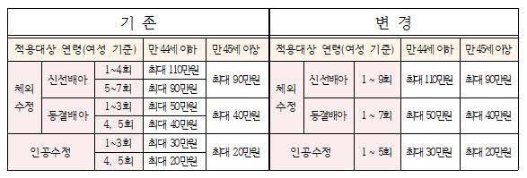 또한, 시술 횟수에 따라 차등 지급하던 지원금도 만 44세 이하 여성기준 체외수정(신선배아) 최대 110만 원, 체외수정(동결배아) 최대 50만 원, 인공수정 최대 30만 원으로 지원 금액이 동일하게 적용된다.