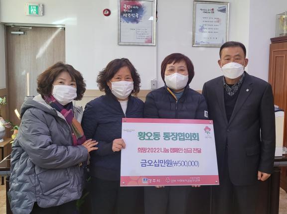황오동 통장협의회는 이웃돕기 성금 50만원을, 자율방재단은 성금 20만원을 기탁하여 임인년 새해에도 온정의 손길을 이어가고 있다.