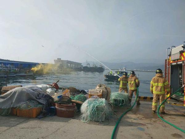 울진해양경찰서는 1월 10일 후포항에서 울진소방서와, 민간해양구조대 합동으로 계류 정박어선 화재 발생 대응 훈련을 실시했다고 밝혔다.