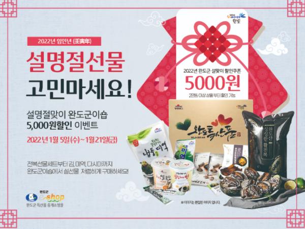 전남 완도군은 1월 21일까지 농수특산물 온라인 쇼핑몰인 ‘완도군이숍’에서 설맞이 할인 행사를 실시한다.