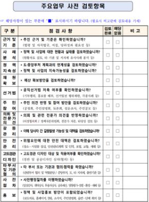 이 제도는 신규사업 및 중요사업 등 주요정책 입안 중 발생하는 행정착오를 예방하기 위해 계획수립단계 시 ▲근거 및 기준 ▲사례분석 ▲정책 지속성 ▲재원 확보 ▲공직선거법 ▲주민참여 ▲의회 및 전문가 의견 ▲갈등관리 ▲안전관리 ▲고도경관 디자인 ▲타부서 및 기관협의 ▲사전절차 ▲홍보 등 13개 분야에 대해 기안자가 사전 검토해 체크리스트를 작성하고 지속 관리하기 위해 마련됐다.