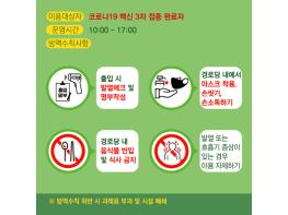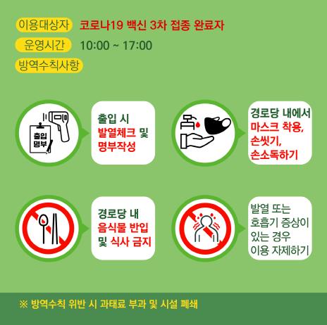 경로당은 3차 예방 접종 완료자를 중심으로 이용이 가능하며, 경로당 내에서는 음식물 섭취금지, 침방울이 튀는 행위 및 마스크 벗는 행위 금지 등 코로나19 경로당 이용수칙을 준수할 수 있도록 경로당 감염관리책임자를 지정하여 사전교육을 실시한 후 운영하고 있다.