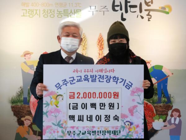 이날 맥씨네 이정숙 대표는 "대학생들에게 1학기 1백만 원을 지원해주는 장학사업으로 자녀들도 장학사업으로 인해 혜택을 보고 있다"라며 "감사한 마음에 지역사회에 환원하고, 무주지역 청소년들을 위한 장학사업에 보탬이 되고자 기탁하게 됐다:라고 말했다.