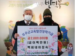 무주군에 추운 겨울을 맞아 장학금과 이웃돕기성금이 잇따르고 있어 훈훈한 감동을 주고 있다. 무주에 소재한 광고대행사 업체인 맥씨네 이정숙 대표가 11일 (재)무주군교육발전장학재단에 200만원을 기탁했다.