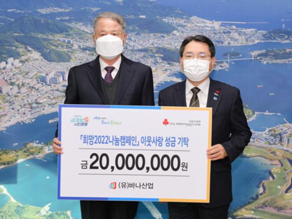 (유)바나산업은 코로나19 장기화로 힘들어하는 어려운 이웃을 위해 11일 성금 2천만 원을 여수시에 전달했다.