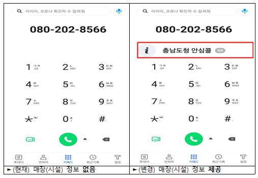 안심콜 번호 확인 서비스는 공공기관이 관리하는 안심콜 공공데이터(상호명, 안심콜 번호 등)와 민간 통신사의 전화 애플리케이션을 연계한 것으로, 전화 앱에서 코로나19 안심콜 번호를 입력하면 매장명이 자동으로 표출된다.
