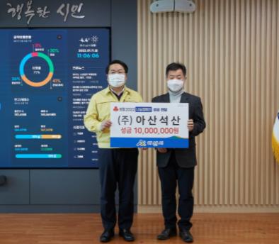 ㈜아산석산이 지난 11일 아산시를 방문해 지역사회 소외계층 나눔 실천을 위한 희망2022나눔캠페인 성금 1000만원을 기부했다.